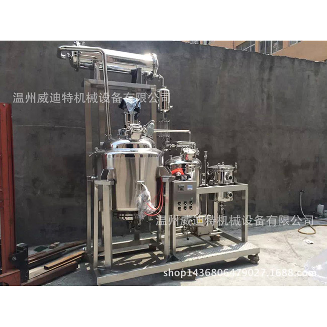 該設備的整個提取過程均采用封閉式循環系統完成。可以在大氣壓或大氣壓下提取。無論是金銀花提取,酒精提取,油提取還是其他目的,給定過程中的所有金銀花都必須根據藥物的性能要求自行切割。提取罐是為金銀花的沸騰提取過程設計的多功能設備,可以提取酒精,回收酒精并分離出揮發油。除提取罐的主要設備外,它還配備了泡沫阱,冷卻器和油水分離器。這些儀器由不銹鋼制成,與藥物接觸,壓力容器檢查部門對中間層的加熱進行了嚴格測試。在萃取過程中,它由冷凝器,油水分離器等組成,并具有完全封閉的循環系統,同時還從廢物中回收有機溶劑。