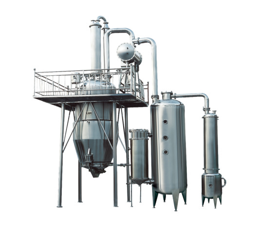投料后經過一定時間的煮提后,即可將較高溫度的提取液經過濾進入濃縮器,二次蒸汽經冷凝后進入集液器后用泵回送到提取罐中,提取罐產生的蒸汽作為蒸發器的熱源,使提取時產生的蒸汽得到充分利用,所以該套設備在節能方面性能十分不錯。溶劑從上到下通過藥材層溶解藥材中的可溶物到提取罐底部,又被抽入濃縮器中濃縮,重復上述過程,從而形成新溶劑,然后經提取濃縮大循環經往返多次后提取完成(提取液到無色),此時提取液停止進入濃縮器,濃縮器繼續進行直到完成所需比重。